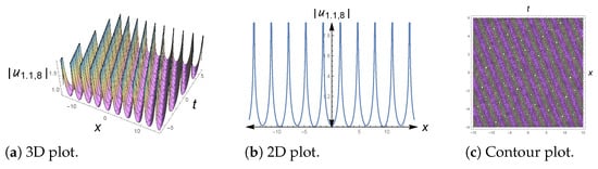 - If and ; thus, the Jacobi elliptic solutions are obtained as follows:orSpecial case. In the case of or , we extract singular solitons or periodic solutions asorand