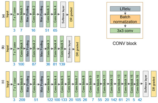 We determined the architecture of the DeepPCANet for each DR dataset and fine-tuned it using the training set of the corresponding DR database; the detail is given in Section 3. After that, the performance of each model was evaluated using the test set of the related database. To validate the usefulness and the superiority of the model design technique, we compared custom-designed models with the widely used state-of-the-art pre-trained CNN models such as ResNet [17], DenseNet [18], and ResNeSt [39], which have shown outstanding performance for various computer vision applications. Additionally, we compared it with AutoML models (Google Cloud AutoML) and Auto-Keras. We fine-tuned the competing models using the same procedure employed for DeepPCANet on each dataset.
