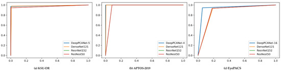 We validated the DeepPCANet models’ performance using the three datasets for SC2. The custom-designed models DeepPCANet-5, DeepPCANet-4, and DeepPCANet-16 for KSU-DR, APTOS2019, and EyePACS, respectively, which were designed and fine-tuned using only fundus images, outperform the highly complex CNN models such as ResnNet152, DenseNet121, and ResNeSt50, which were trained using ImageNet dataset and fine-tuned using fundus images, in terms of all metrics, as shown in Table 5. Though DenseNet121 outperforms ResNet152 and ResNeSt50 on the three datasets, its performance is not better than the custom-designed models. DeepPCANet-5 involves 1.375 M FLOPs, which is smaller than the number of FLOPs of ResNet152, DenseNet121, and ResNeSt50. The number of learnable parameters of DeepPCANet-5 is 73.66K which is much smaller than those of the pre-trained models ResNet152 (60.19 M), DenseNet121 (7.98 M), and ResNeSt50 (27.5 M). In Figure 5, we provide illustrations of the ROC curves on the three datasets using the four models (customized DeepPCANet, ResNet152, DenseNet121, and ResNeSt50). It indicates that the DeepPCANet models’ performance is better than the three pre-trained models on the three datasets.