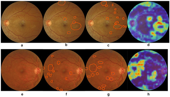 To understand the decision-making mechanism of the custom-designed CNN models, we created the visual feature maps using the gradient-weighted class activation mapping (GradCam) visualization method [86]. The visual feature maps of two random fundus images generated by the DeepPCANet-5 model customized for the local KSU-DR dataset are shown in Figure 6d,h. The same fundus images were given blindly to two expert ophthalmologists at King Khalid Hospital of KSU, and they independently specified the lesion regions manually. Though there is a slight difference in the annotations of both experts, they agreed on most of the lesions, as shown in Figure 6b,c for the fundus image Figure 6a from class moderate and Figure 6f,g for the fundus image Figure 6e from class PDR. The visual features maps of the DeepPCANet-5 model highlight the lesions annotated by both experts, as shown in Figure 6d,h. The yellow and orange splatter in Figure 6d,h indicates that the DeepPCANet-5 model makes decisions based on the features learned from the lesion regions.