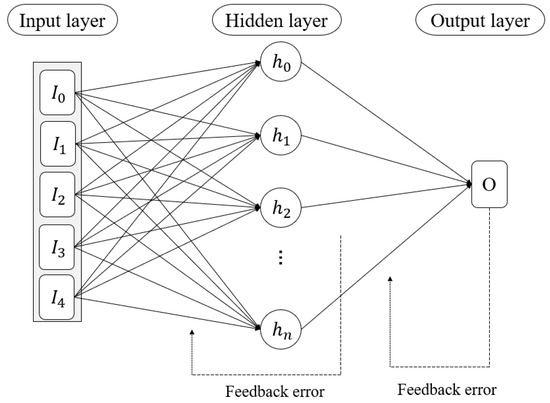 The structure of the LSTM is composed of an input layer, one or more hidden layers, and an output layer. In addition, the number of neurons in each layer is variant when considering different problems. Figure 3 shows the network architecture. When processing an input sequence, the cell states and hidden states are passed through the neurons to obtain the output. During the training process, the network updates the weights and bias terms in such a way that it minimizes the loss of the objective function over the entire training data set, whose MSE is used in this paper. In Figure 3, are the input features of our model. represents the hidden neurons of hidden layers. It only shows one hidden layer in Figure 3. is the output of the network, and in our study, it represents the option price. The weights of each connection are adjusted according to the feedback error. In order to construct a pricing model, each layer of the LSTM is stacked with a set of neurons, as shown in Figure 2. With different amounts of neurons and different number of layers, the LSTM presents different structures and adapts to different problems. The specified topology of the LSTM model used in our study is shown in Section 2.3.