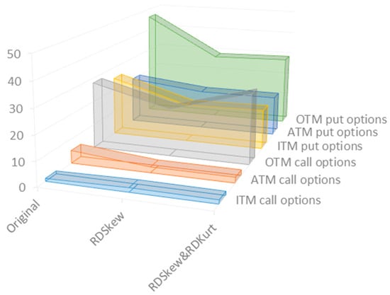 Figure 6 shows the comparison of MAPE among the normal model with of five normal features (the “Original”), the LSTM with realized skewness (the “RDSkew”), and the LSTM with realized skewness and realized kurtosis (the “RDSkew&RDKurt”). As shown in Figure 6, the pricing model with realized skewness has a superior performance in the majority of moneyness states. As for the ITM call option, the model that does not consider realized skewness and realized kurtosis, the Original, performs with the best accuracy.