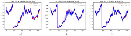 The performance of ATM call options in different features (a) represents the LSTM with realized skewness, (b) represents the LSTM without realized skewness, (c) represents the LSTM with realized skewness and realized kurtosis.