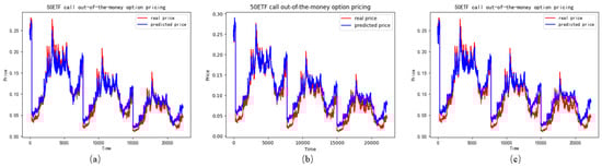The performance of OTM call options in different features (a) represents the LSTM with realized skewness, (b) represents the LSTM without realized skewness, (c) represents the LSTM with realized skewness and realized kurtosis.