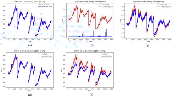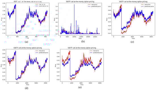 The pricing performance of ATM call options on each model (a) stands for the LSTM model, (b) stands for the BS model, (c) stands for the SVM model, (d) stands for the Random forests model, (e) stands for the RNN model.