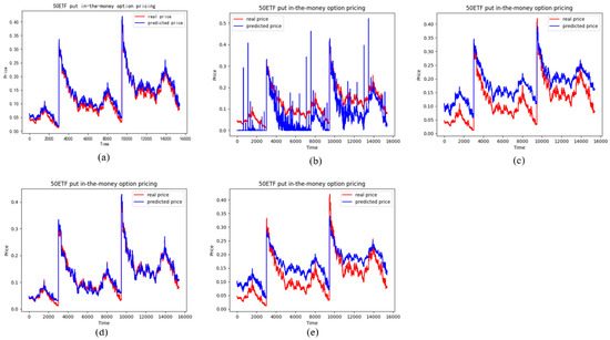 The pricing performance of ITM put options on each model (a) stands for the LSTM model, (b) stands for the BS model, (c) stands for the SVM model, (d) stands for the Random forests model, (e) stands for the RNN model.