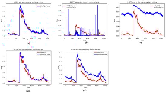 The pricing performance of ATM put options on each model (a) stands for the LSTM model, (b) stands for the BS model, (c) stands for the SVM model, (d) stands for the Random forests model, (e) stands for the RNN model.