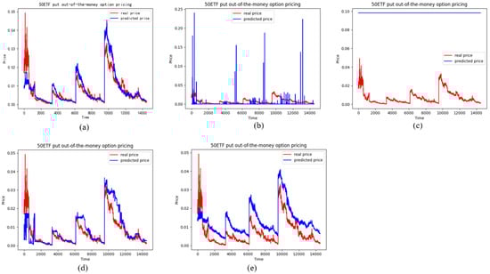 The pricing performance of OTM put options on each model (a) stands for the LSTM model, (b) stands for the BS model, (c) stands for the SVM model, (d) stands for the Random forests model, (e) stands for the RNN model.