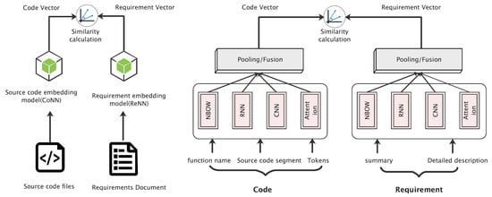 In view of the powerful representation and feature extraction capabilities of neural networks, this paper proposes a neural-network-based tracing model, RCT, which consists of four layers, as shown in Figure 1. These are the input layer, the embedding layer, the pooling/fusion layer, and the comparison layer. The source code and requirements are finally embedded into a unified vector space after passing through these four layers, and the similarity between them is compared.