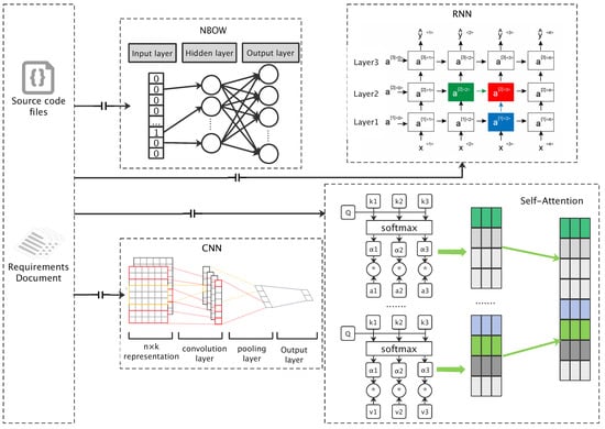 The tracing model’s most important component is converting the software requirements and source code into feature vectors via a neural network, which extracts the semantic information in the software requirements and source code as input to the comparison layer. The network consists of the embedding layer and the pooling/fusion layer. Due to the differences in the textual composition of software requirements and source code, the words included in these texts are only partially semantically relevant. Neural network models can be more accurate if they can process the contextual relationships and remove distracting words to obtain the textual semantics of sentences, paragraphs, and documents. Source code is a list of readable instructions under specific authoring rules and has a much more complex structure than text written in natural language. Source code files contain many file names, function names, variable names, etc. Some of these contain the textual semantics of the source code, while others are related to the implementation of functions. In this paper, four embedding neural network models are selected, namely, neural bag of words (NBOW), recurrent neural network (RNN), convolutional neural network (CNN), and self-attention network. The overall structure of the word embedding layer is shown in Figure 2.