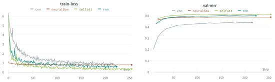 Figure 7 shows the change in the loss function values of the model and the MRR values as the training process continues to advance. The overall performance of the neural bag-of-words model (NBOW) changes less as the training process progresses. In addition, the convolutional neural network (CNN), recurrent neural network (RNN), and self-attention models gradually decrease the value of the loss function and increase the value of MRR as the training process progresses. CNN has the slowest convergence rate and the worst MRR value in the validation set. Self-attention has the best performance on the validation set and performs slightly better than RNN.