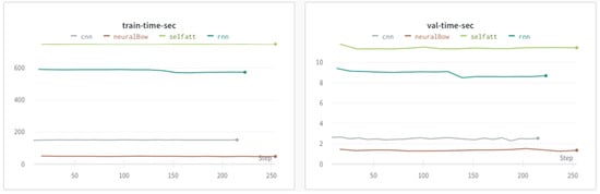 We also compare the time overhead of each neural network model. In Figure 8, the vertical coordinate is the time required to train or validate the data within a single epoch. The NBOW structure is relatively simple, and the CNN can reduce the time overhead through weight sharing and sparse connections. Self-attention has the best performance but also has more time overhead. However, in practice, when using RCT to construct the requirement-code traceability links, the difference in time overhead is not significant (as can be seen from the time difference in seconds required to perform the validation set analysis). Thus, it does not cause problems for the user due to excessive overhead time. Self-attention is still the best neural network model.