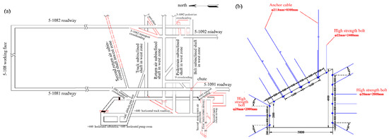 The roadway excavated on a large inclination coal seam was selected at the 5-1081 roadway in a coal mine located in Shanxi, China. The working face elevation is about +385 m~+550 m. The schematic diagram of the working surface is shown in Figure 1a. The 5-1081 roadway is a trapezoidal section with a width of 5.0 m, a low height of 2.0 m, a high height of 4.9 m, and a roof inclination of 30°. Steel band, cable, and rock bolt support are adopted, with a φ22 mm × 2400 mm left-hand threaded steel high-strength rock bolt at the top and a φ20 mm × 2000 mm left-hand threaded steel high-strength anchor rod at the gang, with the distance between rows of anchor rods being 800 mm × 800 mm. A φ21.8 mm × 8300 mm anchor rope is used at the top, with the distance between rows being 1600 mm × 3200 mm in a group of three. The section parameters of the roadway support are shown in Figure 1b.