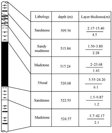According to geo-stress tests, the maximum horizontal stress of the roadway is about 6.56 MPa and the vertical stress is about 8.25 MPa, which can be regarded as being in a state of uniform pressure of 7.41 MPa. From the results of the rock mechanics parameter test shown in Figure 3, it is known that the elastic modulus of the sandstone is 3.5 GPa and Poisson’s ratio is 0.24. The uniaxial compress strength of sandstone, limestone, and mudstone are 40.55 MPa, 117.56 MPa, and 54.93 MPa, respectively.