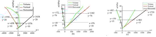 Stress−strain curve of (a) sandstone, (b) limestone, (c) mudstone in 5# coal seam.