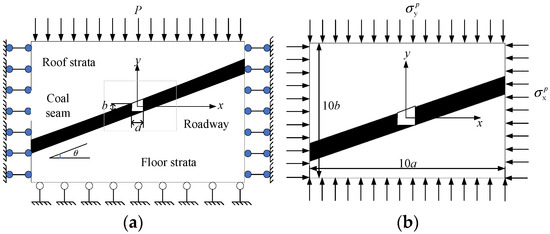 According to the geometric characteristics of the large inclination roadway, it is simplified to a trapezoidal orifice problem in an infinite plane, as shown in Figure 4a. The uniform load P is applied on the upper side of the overlying rock seam. The left and right boundary conditions are hinge support constraints. The bottom side of this model is a fixed constraint. The short height of the trapezoidal roadway is a, the width is b, and the coal seam inclination angle is θ’. The balanced state is redistributed after excavation. The analysis domain is extracted from the infinite plane, and the geometric is set as ten times the width and height of the trapezoidal roadway. The stress boundary condition is set as the initial geo-stress shown in Figure 4b. The boundary condition on the surface of the trapezoidal roadway was assumed as normal stress and tangential stress-free.