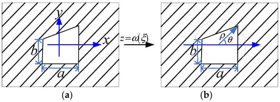 The deformation and stress distribution of roadway rocks are the basis for its supporting design. At present, mechanical analysis of the roadway simplifies the section into a circle. Since the actual roadway form does not match, the results can only be used as a qualitative reference. Some scholars have also analyzed the stress distribution of a rectangular cross-section using the method of complex analysis and conformal map [29], but the results do not apply to trapezoidal roadways with large inclinations. This section uses the method of complex analysis and conformal map to convert the trapezoidal roadway into a circle and derives the formula on the stress and displacement of the surrounding rocks of the trapezoidal roadway.