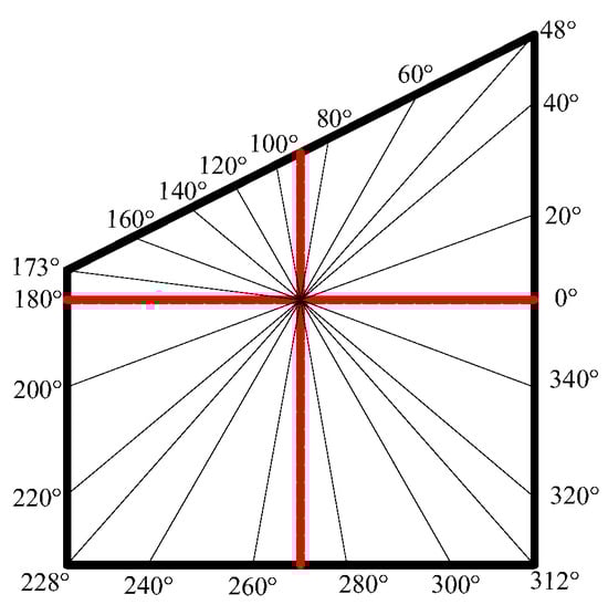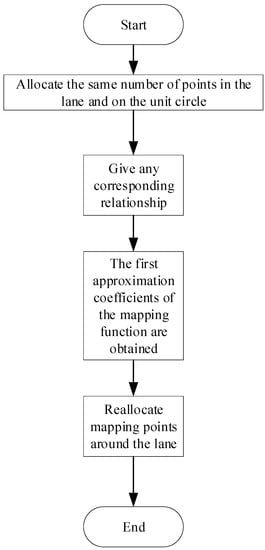 After calculation, the approximate coefficients of the mapping function obtained by Equation (29) are substituted into Equation (25), and according to the correspondence between the requested alleyway and the unit circle, the mapping points corresponding to the projection on the alleyway reflected by the image points marked on the unit circle can be obtained, and these points are unevenly distributed on the periphery. The distance between two adjacent points is recorded in turn and redistributed according to the distance between the mapped points on the perimeter of the requested lane, then the coordinates of the points on the requested lane are marked as . The corresponding image point is still . Substituting into Equations (28) and (29) obtain each coefficient and iterate until the exact value is obtained.