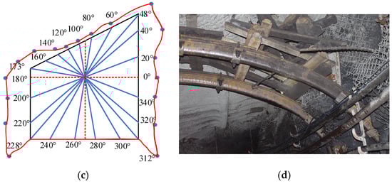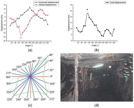Figure 8 shows the polar coordinates location of the surface of the roadway versus the vertical displacement, horizontal displacement, and total displacement. Figure 8a, shows that the horizontal displacement is symmetrical with the calculation azimuth from 0° to 360°. While the vertical displacement shows an unsymmetrical trend, in which the displacement increases with the angle from 0° to 100° and 200° to 280°, the total displacement versus calculation azimuth is shown in Figure 8b. It can be seen the maximum deformation is at an angle of 100°. Figure 8c shows the geometric diagram after deformation, from which the deformation control should pay attention to the angle of 100°, 173°. Figure 8d is the on-site deformation of the roadway. It is clear that in the low side of position 100° to 180 ° there is a clear convergence, and a wood crib was employed to support the roof. In the high side wall there is a lack of free-standing support; thus, a clear side deformation is seen in Figure 8c.