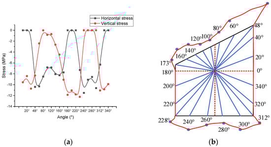 The calculation stress results are shown in Table 2. From Table 2, both the horizontal and vertical stress concentrations occur at the four corners of the roadway, in the position of 48°, 60°, 173°, and 312°. The upper-left corner has the largest concentration, followed by the upper-right corner. In the upper-left corner, the wood crib can be installed for roof-to-floor support, while in the upper-right corner, there is a lack of free-standing support. Therefore, attention should be paid to the most damaged location to control the position in the upper-right corner.