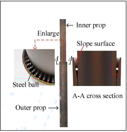 However, there are few efficient and effective supporting materials with constant high working resistance, with supporting length up to 4 m. A yielding prop with high load capacity and adjustable supporting height ranging from 1 m to 4.5 m was introduced by our previous studies [30,31]. The main schematic structure of the prop is shown in Figure 10, which is a compound apparatus consisting of three parts: an outer prop with an inner surface, an inner prop, and steel balls. The steel balls are uniformly located in the sloping ramp arrangement for setting the inner and outer props in place concerning each other. Due to the self-lock function of steel balls under gravity, tools are not required for installing the prop. The steel balls interlock between the inner and outer props, generating a reactive load. Therefore, the innovative prop is suitable to install on the upper side to support the roof and floor with constant working resistance.