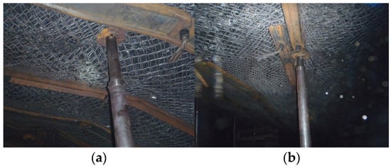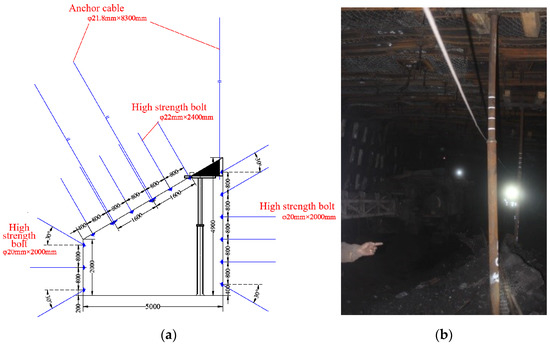 According to the on-site drilling TV results on broken rock height, the loosening range was about 5 m. Therefore, the weight of the rock within the loosening circle is regarded as the weight to be supported by the high-yielding prop. The average weight of the roof rocks is 16 kN/m3. Combined with the roadway width of 4 m, it was calculated that each 1 m length of the roadway needs to support a strength of about 400 kN. If only high-yielding props were employed, the density of the prop would be too large to meet pedestrians, ventilation, transportation, etc. To reduce the density of high-yielding props, cable was used to replace some high-yielding props, and high-strength plastic mesh and steel bands were employed to enhance the hanging effect on the cable. The specific supporting parameters are shown in Figure 11a: the row of the high-yielding prop with working resistance of 400 kN was set to 5 m, and the column distance was 1.6 m. The π-shaped beam was used to connect the roof, and the pillar boots were worn for it. Two anchor cables of 8.3 m in length and 21.8 mm in diameter were installed in the trapezoidal roof with a preload of 100 kN, a row spacing of 1000 mm, and a row spacing of 1600 mm; rock bolts of 2.4 m in length and 22 mm in diameter were used with a preload of 40 kN, a row spacing of 900 mm. Figure 11b shows the physical picture of the supporting.