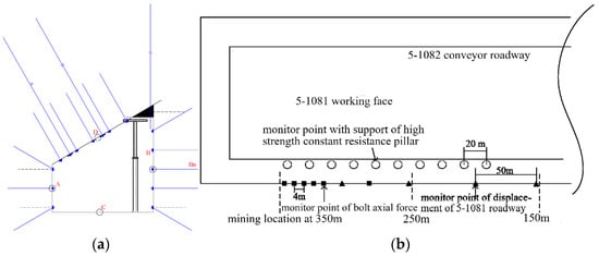 Measuring point location of 5-1081 roadway: (a) measurement point on roadway cross-section diagram; (b) layout diagram of the monitoring points.
