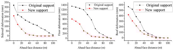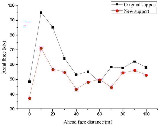 Figure 15 shows the rock bolt axial forces versus the working face distance on original supports and new supports. It is clearly shown that the axial forces decrease at a range of 5 kN to 26 kN. In the position on the ahead face 10 m, the axial force differences reach the maximum value of 26 kN, which indicates the maximum deformation range. After this position, the differences become general, which indicates the slow deformation of rocks after the ahead face distance of 10 m.