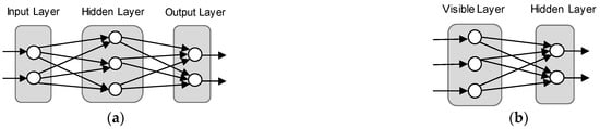 Restricted Boltzmann machines (RBMs) are stochastic neural networks that consist of a visible layer and a hidden layer. The joint probability distribution of these two layers is learnt, as shown in Figure 1. RBM weights are trained using a contrastive divergence algorithm that approximates the gradients of different functions [19,20]. RBMs can be stacked and used as an unsupervised pretraining module in a deep neural network (DNN) called a deep belief network (DBN) that initializes the weights of the MLP module within the DBN.