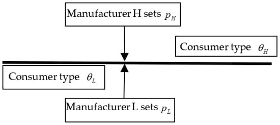 In the benchmark market, as shown in Figure 1, manufacturers H and L first decide price, respectively, according to their competitor’s quality and cost, i.e., and . After the consumers observe the prices of the manufacturers’ products, they choose products according to utility.