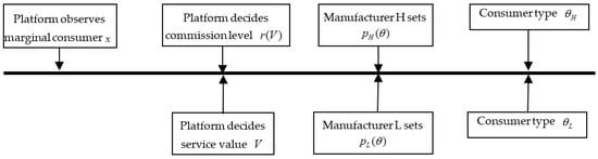Meanwhile, in the platform market, as shown in Figure 2, the platform first observes the distribution of marginal consumer type x and determines the market service value , as well as the commission level , before manufacturers make decisions. Then, the manufacturers, H and L, simultaneously decide the product price and quality, according to the service value and commission level of the platform, i.e., (,) and (,). Lastly, heterogeneous consumers determine which product to purchase. We solve the equilibrium of the game by backward induction.