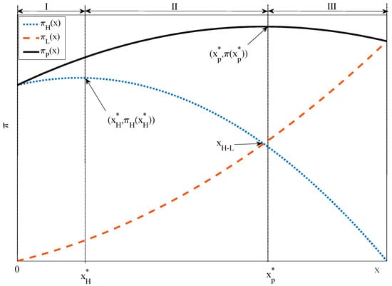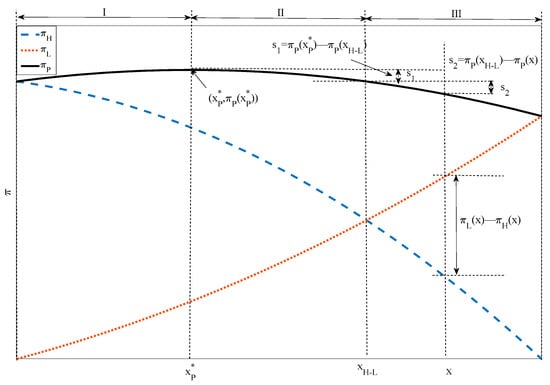 By taking a partial derivative of the manufacturers’ profits in (10), with respect to and , we can obtain , , , , and . According to the Hessian matrix, when , we can know that . In addition, when , and when , , indicating that when , manufacturer H will attain the highest profit. Similarly, when and , it is easy to obtain , so that manufacturer L will benefit most at .
