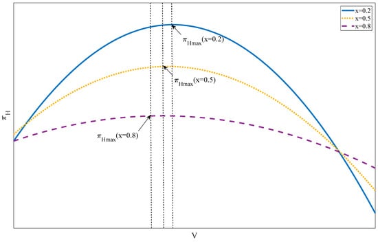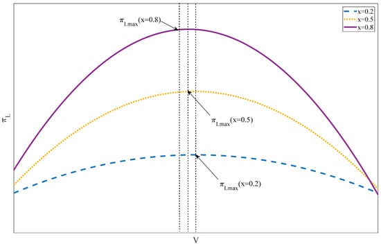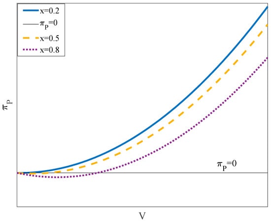 In addition, as shown in Figure 6, the extent of consumers preferring low-quality products also affects the platform’s profit. When the proportion of consumers with the low-quality preference increases, i.e., x is increasing, the platform suffers. Therefore, the platform needs to promote service value, for example, let . Furthermore, improving the service value of the platform can effectively guide consumers to purchase high-quality goods and reduce the x. Through these measures, the platform can maintain a benign development, thereby achieving increasing profitability.