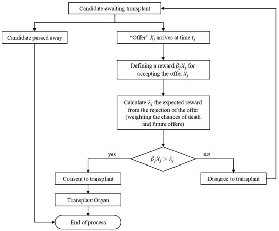 The DY rule works as follows. When an organ arrives, a decision about whether to accept it or not is made based on the “value” of that organ and the prospective expected “value” of waiting for a (hopefully) better one in the future. If the organ is accepted, the process terminates, and the candidate goes through the transplantation process. Otherwise, the offer is lost, and the process continues until the next kidney arrives or until the candidate dies. The rule is illustrated in Figure 1.