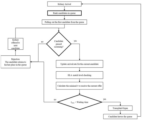 The organ allocation component: the waiting list is sorted by the patient’s arrival time in this model. According to EDY, the organ is offered to the first candidate on the waiting list. Then three actions are performed: in the first stage, the kidney blood type compatibility with the candidate is checked. The second step, called “crossmatch”, must be passed for the candidate to accept the kidney. The third step is the “candidate decision”. The candidates contemplate if they should accept the offer (kidney) and leave the system or wait for the next arrival. This decision is made using mathematical calculations that combine the “single-candidate algorithm” and EDY. If the kidney successfully goes through those three steps, the candidate receives the kidney and leaves the waiting list. If it does not, the next candidate on the list goes through the above steps. Finally, if none of the candidates decides to take the kidney before it passes its shelf-life, it is disposed of and logged in a file.
