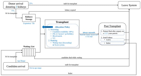 - Thompson, D.; Waisanen, L.; Wolfe, R.; Merion, R.; Mccullough, K.; Rodgers, A. Simulating the Allocation of Organs for Transplantation. Health Care Manag. Sci. 2004, 7, 331–338. [Google Scholar] [CrossRef] [PubMed]