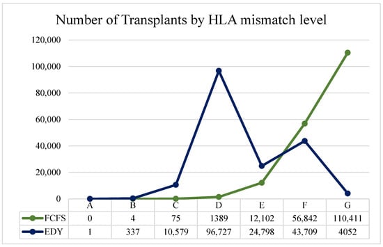 During each simulation run, 430,000 candidates joined the waiting list (starting with 100,000 patients), and only 180,000 transplantations were performed over 3660 days (the number of days closest to 10 years divided into 20-time segments giving a whole number, 183 days per segment). According to the OPTN data reports [2], over 40,000 applicants join the kidney transplant waiting list every year. In addition, to test the effect on the quality of life over five years between transplant and the time of death, we will perform a twice as long (10 years) simulation. The results exhibit equity and clinical efficiency, waiting time STD, and the number of transplantations for any match level (A to G), as discussed next.