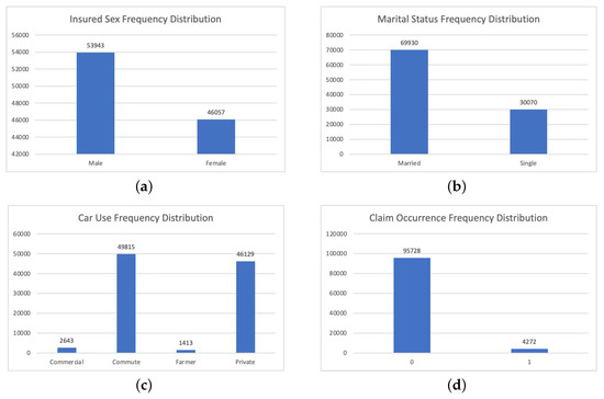 The frequency distributions for categorical variables used in this work, including Insured Sex (a), Marital Status (b), Car Use (c) and Claim Counts (d), which is the response variable for model that predicts claim probability.