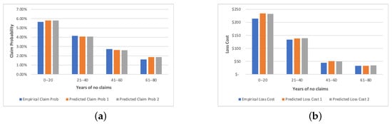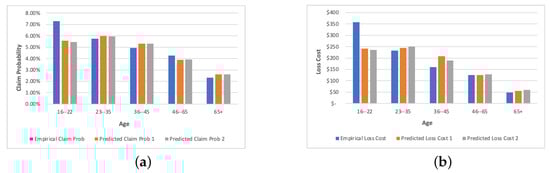 Comparison of empirical and the predicted values of claim probability and loss cost by different age groups. (a) presents the results of claim probability. (b) corresponds to the loss cost. The orange bar shows results for predictions without using clusters. The grey bar presents results for predictions with designed clusters.