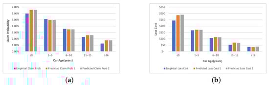 Comparison of empirical and predicted values of claim probability and loss cost by car age groups. (a) presents the results of claim probability. (b) corresponds to the loss cost. The orange bar shows results for predictions without using clusters. The grey bar presents results for predictions with designed clusters.