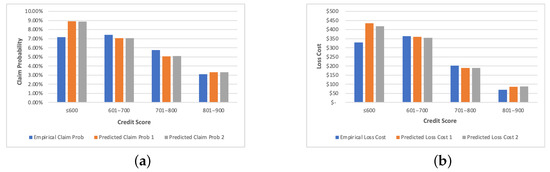 Comparison of empirical and predicted values of claim probability and loss cost by Credit Scores. (a) presents the results of claim probability. (b) corresponds to the loss cost. The orange bar shows results for predictions without using clusters. The grey bar presents results for predictions with designed clusters.