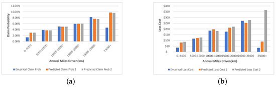 Comparison of empirical and the predicted values of claim probability and loss cost by Annual Mileage Driven (a) presents the results of claim probability. (b) corresponds to the loss cost. The orange bar shows results for predictions without using clusters. The grey bar presents results for predictions with designed clusters.