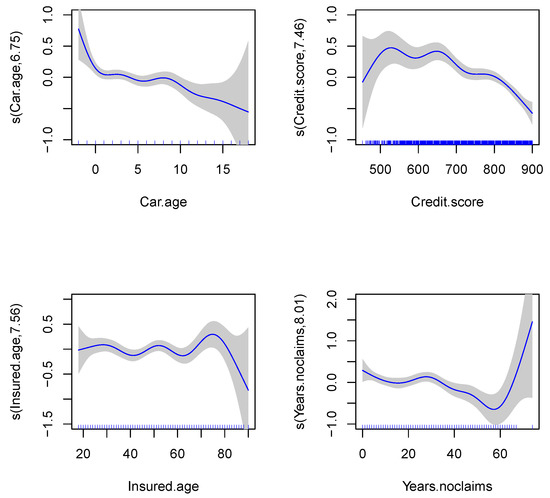 One of the key characteristics in GAM modelling is the additive component, which can be used to reflect if the impact from such a variable is significant and if the functional relationship is significantly non-linear. We display the relevant results in Table 5 to explore this. In Table 5, the effective degree of freedom for all additive components is greater than one, and they are all statistically significant, indicating a non-linearity of each additive component. So, we further investigate the functional patterns for each numerical risk factor. Figure 7 displays the functional pattern of Car Age, Credit Scores, Insured Age, and Year of no Claims, respectively. They are the four smooth terms included in the GAM for predicting claims. The results show that the sampling errors become much larger for the groups with fewer risk exposures. This leads to the confidence intervals being much wider for those groups. With the increase in the Car Age, the effect on the claim amounts decreases. From the functional pattern of the Car Age, we see that the new car has a much greater impact on the claim amounts. The general functional pattern of Credit Scores decreases with the increase in scores, implying that a driver with higher Credit Scores seems to represent a greater risk. Additionally, it is interesting that the pattern is periodic, with a frequency of approximately 20. After 80 years old, the claim amounts’ impact continues to be negative. As for Years of no Claims, the trend appears to decrease with the increase in the number of Years of no Claims. After the number of Years of no claim reaches 60, the impact on claim amounts becomes positive.