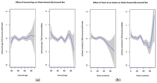 The plots of fitted spline functions for Insured Age and Years of no Claims, separated by Insured Sex. (a) Insured Age by Insured Sex; (b) Year of no Claims by Insured Sex.