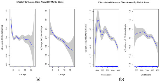 The plots of fitted spline functions for Car Age and Credit Scores, separated by Marital Status. (a) Car Age by Marital Status; (b) Credit Scores by Marital Status.