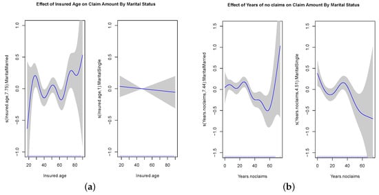The plots of fitted spline functions for Insured Age and Years of no Claims, separated by Marital Status. (a) Insured Age by Marital Status; (b) Years of no Claims by Marital Status.