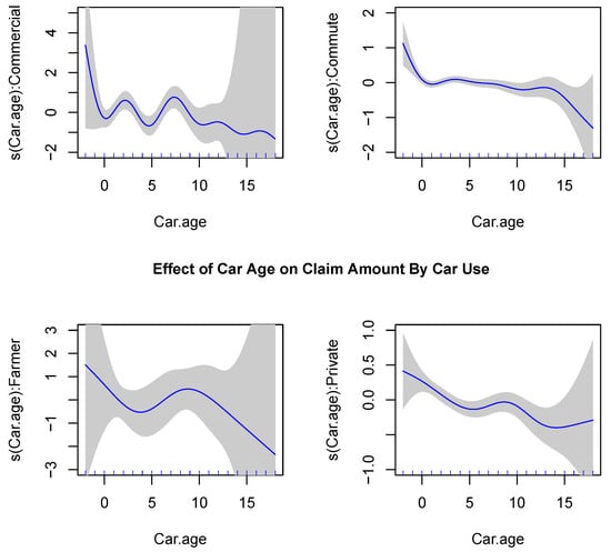 The plots of fitted spline functions for Car Age, separated by Car Use.