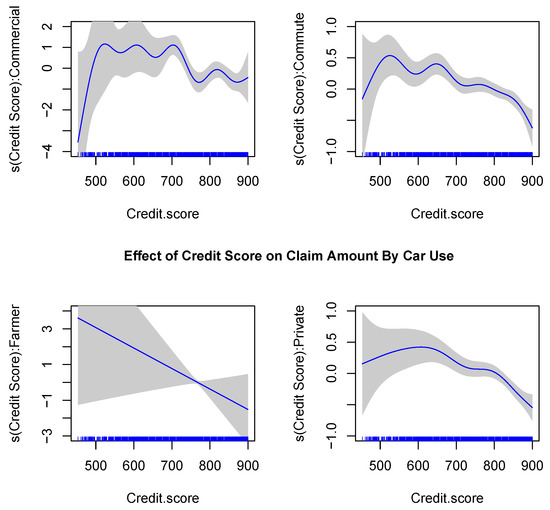 The plots of fitted spline functions for Credit Scores, separated by Car Use.