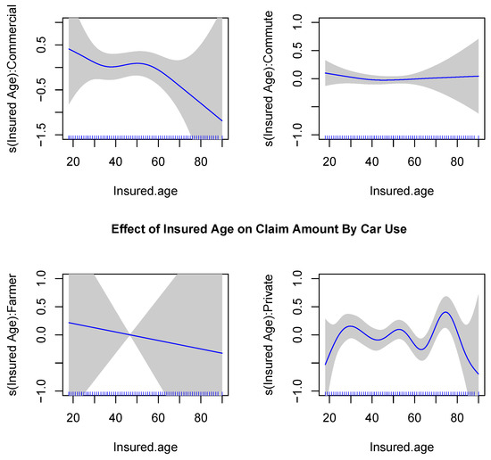 The plots of fitted spline functions for Insured Age, separated by Car Use.