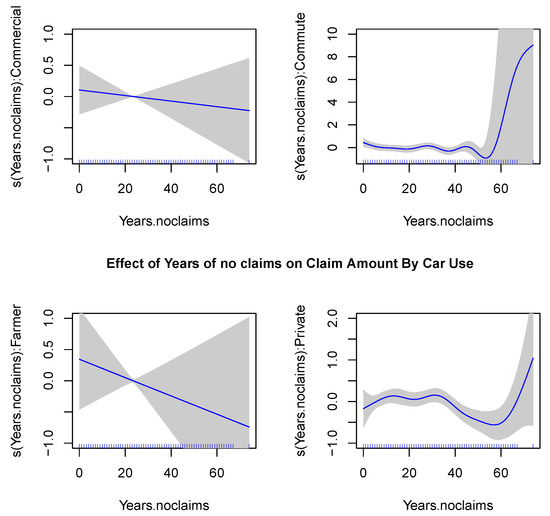 The plots of fitted spline functions for Years of no Claims, separated by Car Use.